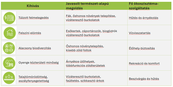 Fontos mielőbb meghatározni, hogy milyen eredményt várunk a természetalapú megoldásunktól (pl. vízáteresztő felületek aránya, felszíni lefolyás csökkenése, hőkomfort növekedés). Ezek igazodjanak a helyi sajátosságokhoz és nem egyetlen mutató maximalizálására kell törekedniük, hanem mérsékelt, de összeadódó előnyöket biztosítaniuk.